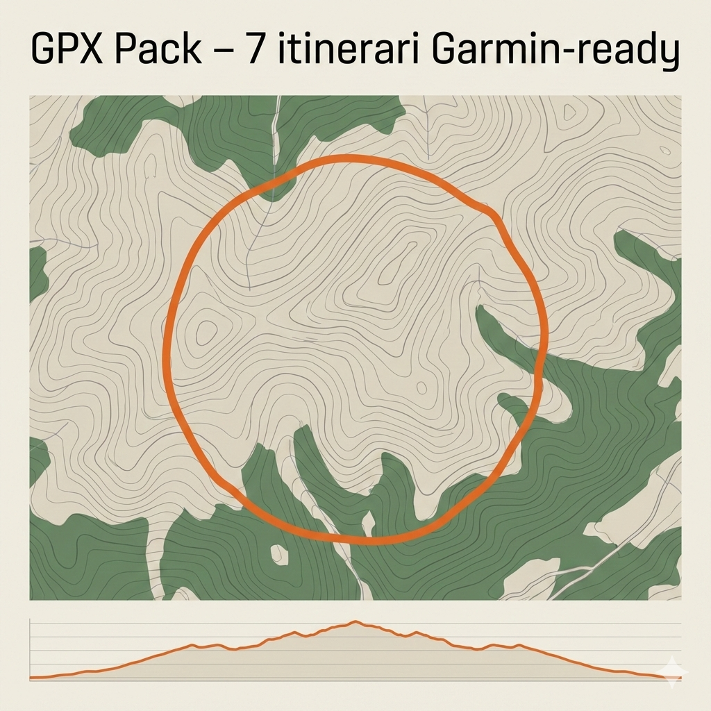 Il GPX Pack contiene le tracce complete dei 7 itinerari, già ricomposte e pronte da caricare su dispositivi GPS come Garmin o su altre app compatibili.
